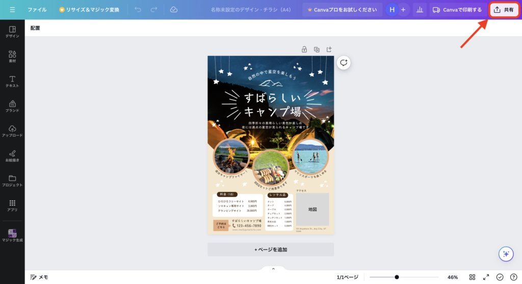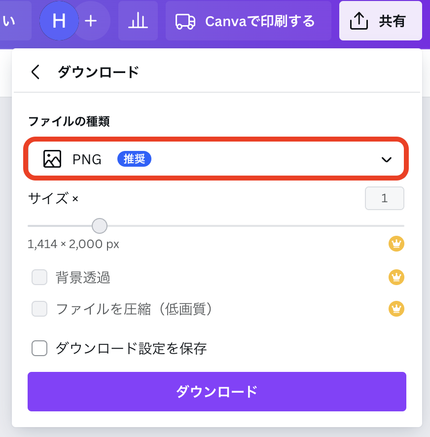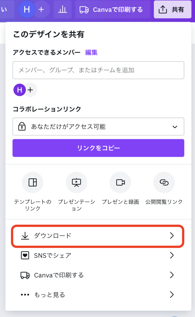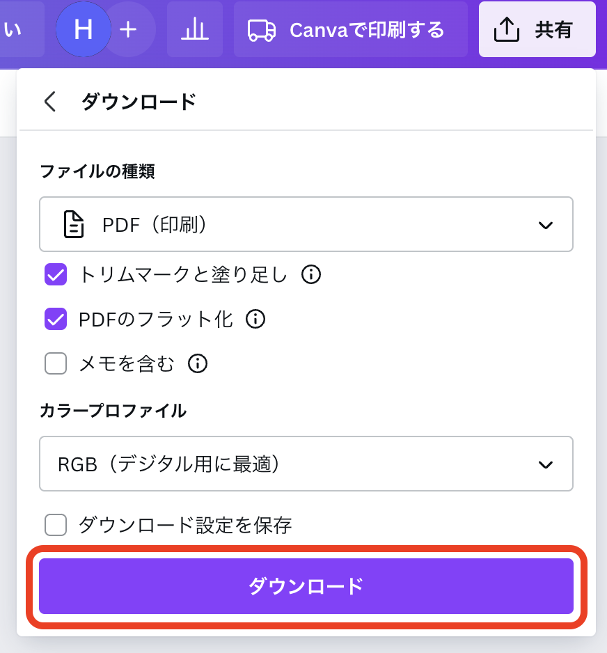 Canvaには直接的な「アウトライン化」機能はなく、代わりに「PDFをフラット化する」を利用します。
